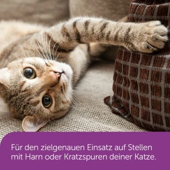 FELIWAY® ist dem natürlichen Wohlfühlpheromon der Katze nachempfunden. Das Spray hilft perfekt, dem Harn- und Kratzmarkieren der Katze punktuell vorzubeugen. Sind bestimmte Stresssituationen im Haus (z.B. Konflikte im Mehrkatzenhaushalt) Ursache für das Kratzen oder Harnmarkieren, wird der Einsatz des Sprays ideal durch den FELIWAY® Happy Home Verdampfer unterstützt.Vorbeugend angewendet hilft es Katzen, sich schneller an neue Möbel (neue Schlafhöhle, neuer Transportkorb, neues Sofa) zu gewöhnen und beugt stressbedingtem Verhalten wie z.B. Kratzen und Harnmarkieren vor. Das Wichtigste zu dem FELIWAY® Spray im Überblick: • Eine 60 ml Flasche enthält ca. 400 Pumpstöße (ca. 8 Pumpstöße pro Anwendung)• Von Tierärzten entwickelt und empfohlen• Reduziert Kratzmarkieren schon nach 7 Tagen um 80% (Pageat, 2003)• Hilft, unerwünschtes Verhalten zu kontrollieren• Hilft Katzen sich zuhause zu fühlen Wie funktioniert FELIWAY®?Katzen nehmen Pheromone aus ihrer Umgebung über einen Bereich nahe der Nase wahr. Das natürliche Gesichtspheromon wird von der Katze an der Wange produziert und wird immer dann abgesetzt, wenn sie sich in ihrer Umgebung geborgen und sicher fühlt. Dazu reiben Katzen mit ihrem Kopf z.B. an Personen, Möbeln, Durchgangspassagen und andere Bereichen des Zuhauses. Sie hinterlässt dabei, für Menschen nicht wahrnehmbar, eine Duftmarke: das Gesichtspheromon der Katze. Dieses „Glückspheromon“ vermittelt der Katze Sicherheit und Entspannung. FELIWAY® ist die synthetische Nachbildung dieses Pheromons und hat denselben entspannenden Effekt auf Katzen. Fehlen diese „Glückspheromone“, z.B. weil die Katze zu gestresst ist oder in eine ihr unbekannte Umgebung wie ein neues Zuhause gebracht wurde, sorgt FELIWAY® schnell und unkompliziert für Wohlbefinden – die Unterstützung für ein harmonisches Zusammenleben von Mensch und Katze. AnwendungHarnmarkieren: Die betroffenen Stellen gründlich mit medizinischem Alkohol oder Wasser reinigen und trocknen lassen. Einmal täglich 1 Sprühstoß FELIWAY® aus ca. 10 cm Entfernung auf die betroffene Stelle sprühen. Nicht in Anwesenheit der Katze sprühen, da der anfängliche intensive Alkoholgeruch/ das Sprühgeräusch die Katze irritiert. Der Alkoholgeruch verflüchtigt sich (wie bei Parfüm) nach wenigen Minuten. Die Katze erst in den Raum lassen, wenn die mit FELIWAY® besprühte Stelle getrocknet ist. Täglich nachsprühen um ein erneutes Markieren der Katze zu verhindern. So lange anwenden, bis die Katze an den Stellen mit dem Kinn reibt und eigene Gesichtspheromone setzt.Kratzen: Einmal täglich 6 Sprühstöße FELIWAY® auf die betroffene Stelle sprühen. Nicht in Anwesenheit der Katze sprühen, da der anfängliche intensive Alkoholgeruch/ das Sprühgeräusch die Katze irritiert. Der Alkoholgeruch verflüchtigt sich (wie bei Parfüm) nach wenigen Minuten. Die Katze erst in den Raum lassen, wenn die mit FELIWAY® besprühte Stelle getrocknet ist. Täglich nachsprühen um ein erneutes Kratzmarkieren der Katze zu verhindern. So lange anwenden, bis die Katze an den Stellen mit dem Kinn reibt und eigene Gesichtspheromone setzt.FELIWAY® Spray ist ein Umgebungsspray. Nicht direkt auf Katzen sprühen. Was ist FELIWAY®?FELIWAY® für ein entspanntes Zusammenleben FELIWAY® ist eine Produktreihe, die Katzen in neuer Umgebung und in stressreichen Situationen, die mit unerwünschtem Verhalten wie Harnmarkieren oder Kratzen einhergehen können, hilft, zu entspannen. FELIWAY® hilft Vertrauen zu vermitteln und signalisiert Katzen, dass es keine Notwendigkeit gibt, unerwünschte Reviermarken im Haus zu hinterlassen.FELIWAY® zuhause eingesetzt, hilft Ihrer Katze sich sicher zu fühlen und wieder zur Ruhe zu kommen. FELIWAY® reduziert Stress, der zu unerwünschten Verhalten führen kann. Dies ist wissenschaftlich belegt.**Die Effektivität von FELIWAY® wurde in zahlreichen wissenschaftlichen Studien belegt, die in namhaften wissenschaftlichen Journalen erschienen und auf internationalen Kongressen vorgestellt wurden.Die FELIWAY®-Pheromon-Produkte schenken Kitten und Katzen jeden Alters die nötige Geborgenheit und helfen ihnen, sich sicher und wohl zu fühlen: • in neuer Umgebung und bei allen Veränderungen im Revier (neues Zuhause, Umzug, Urlaub, Katzenpension, neuen Möbeln, Renovierung, neuen Familienmitgliedern oder neuen Haustieren)• bei stressreichen Ereignissen (Partys, Feuerwerk)• im Mehrkatzenhaushalt• bei Autofahrten oder Besuchen beim Tierarzt.FELIWAY® hilft stressbedingtes, unerwünschtes Verhalten der Katze zu verhindern.