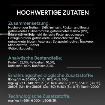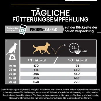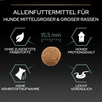 Entwickelt von unseren Tierärzten und Ernährungswissenschaftlern, verbessert PURINA PRO PLAN die Gesundheit des Verdauungssystems – Unser vollwertiges, getreidefreies Hundefutter ist speziell auf die Bedürfnisse von ausgewachsenen Hunden mittleren und großen Rassen abgestimmt. Es enthält eine ausgewählte präbiotische Quelle, die nachweislich ein gesundes Verdauungssystem und eine normale Kotkonsistenz fördert.